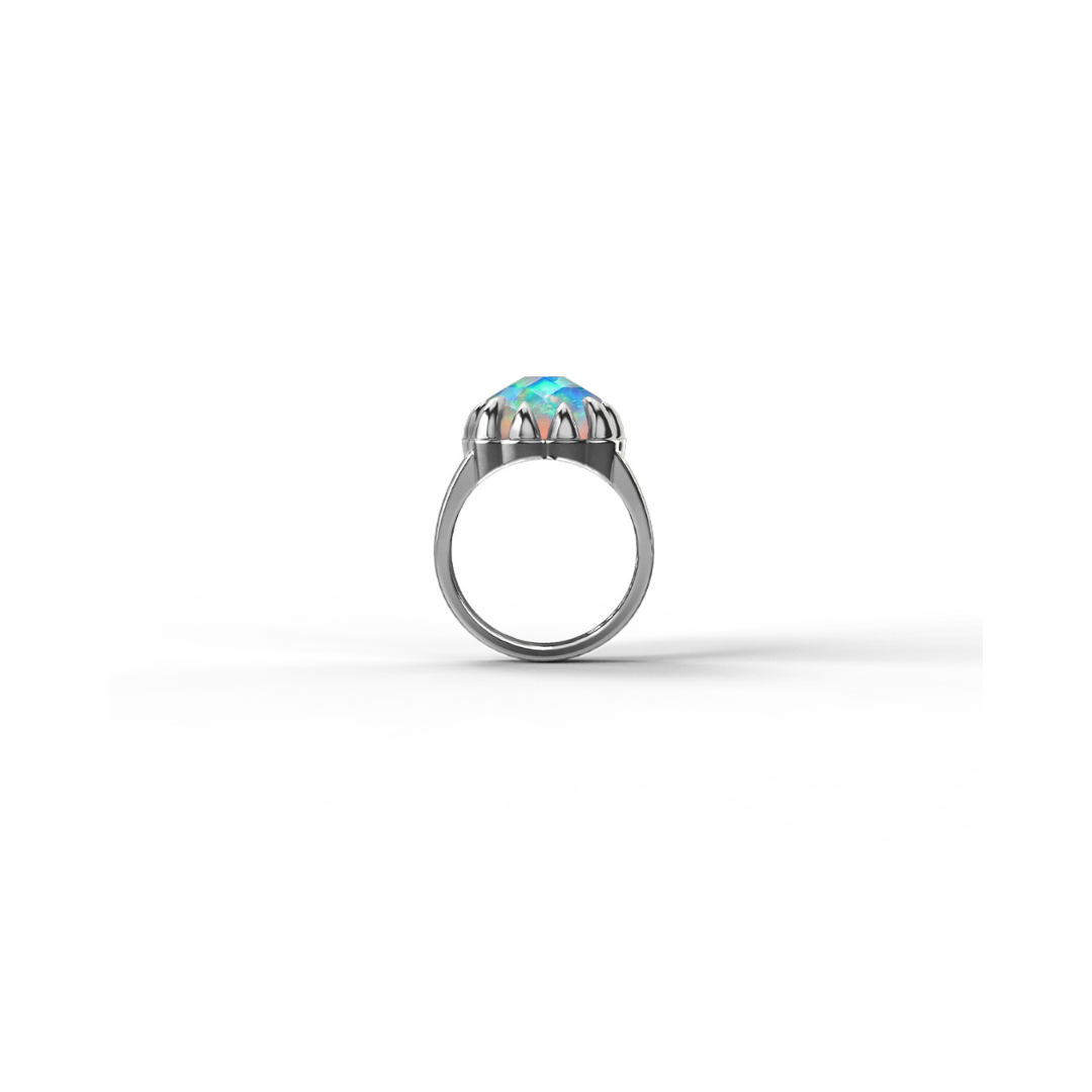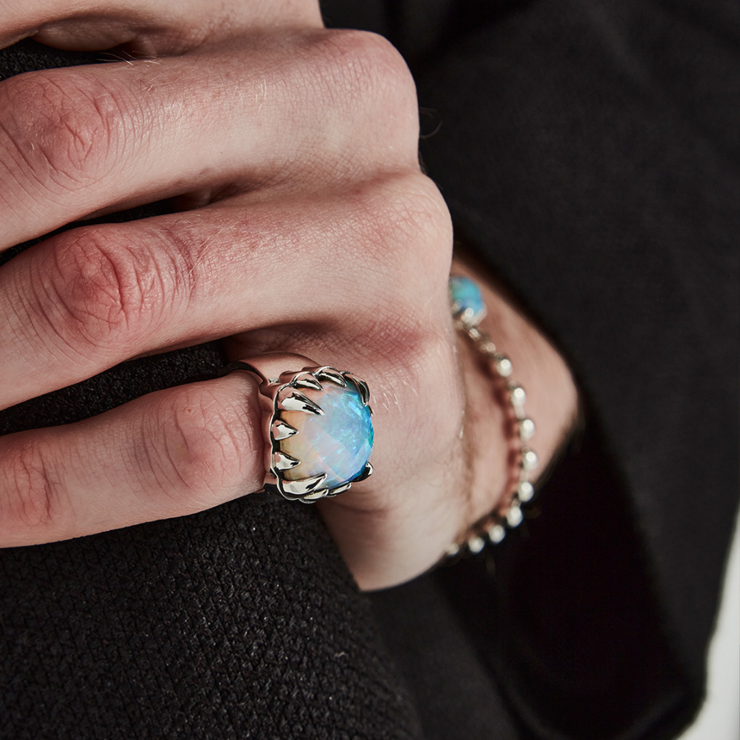 The signature Claw Ring by Stolen Girlfriends Club - an iconic statement for over a decade, combines strength and elegance. Set in high-polish sterling silver, it features a luminous Bello Opal that catches the light with flashes of green, blue, and purple.