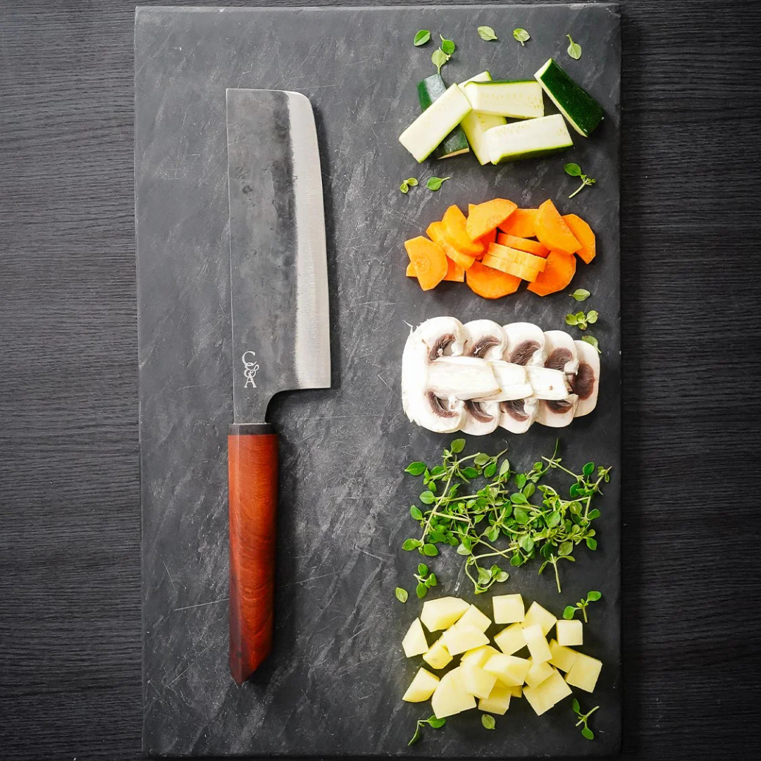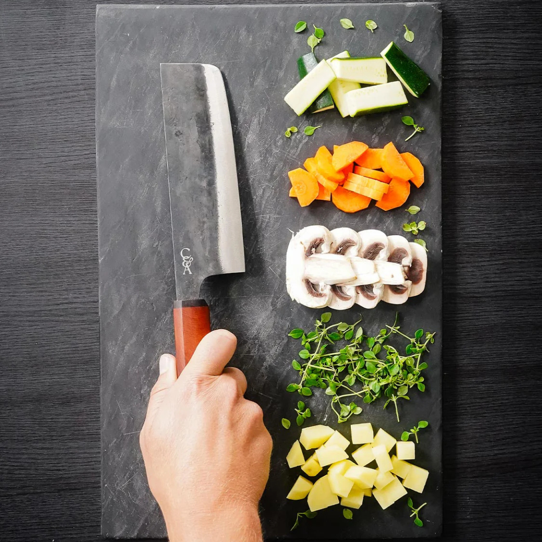 Originally developed in Japan as a home cook’s go-to vegetable knife, the Nakiri shape is all about rhythm and efficiency. Gabriel carries that same energy into modern kitchens. Whether you’re prepping meals for the week or cooking something fresh from the garden.