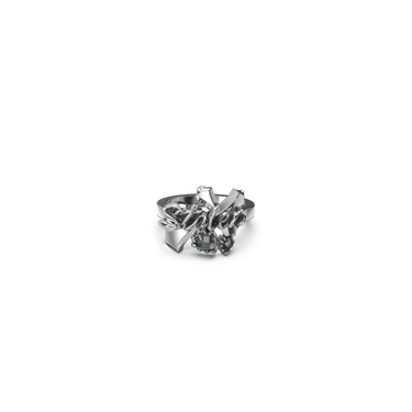 A bold sculptural design from Stolen Girlfriends Club, this statement ring unites the brand’s signature script with a reworked gothic cross. Set with clear quartz, it offers a polished take on modern iconography.