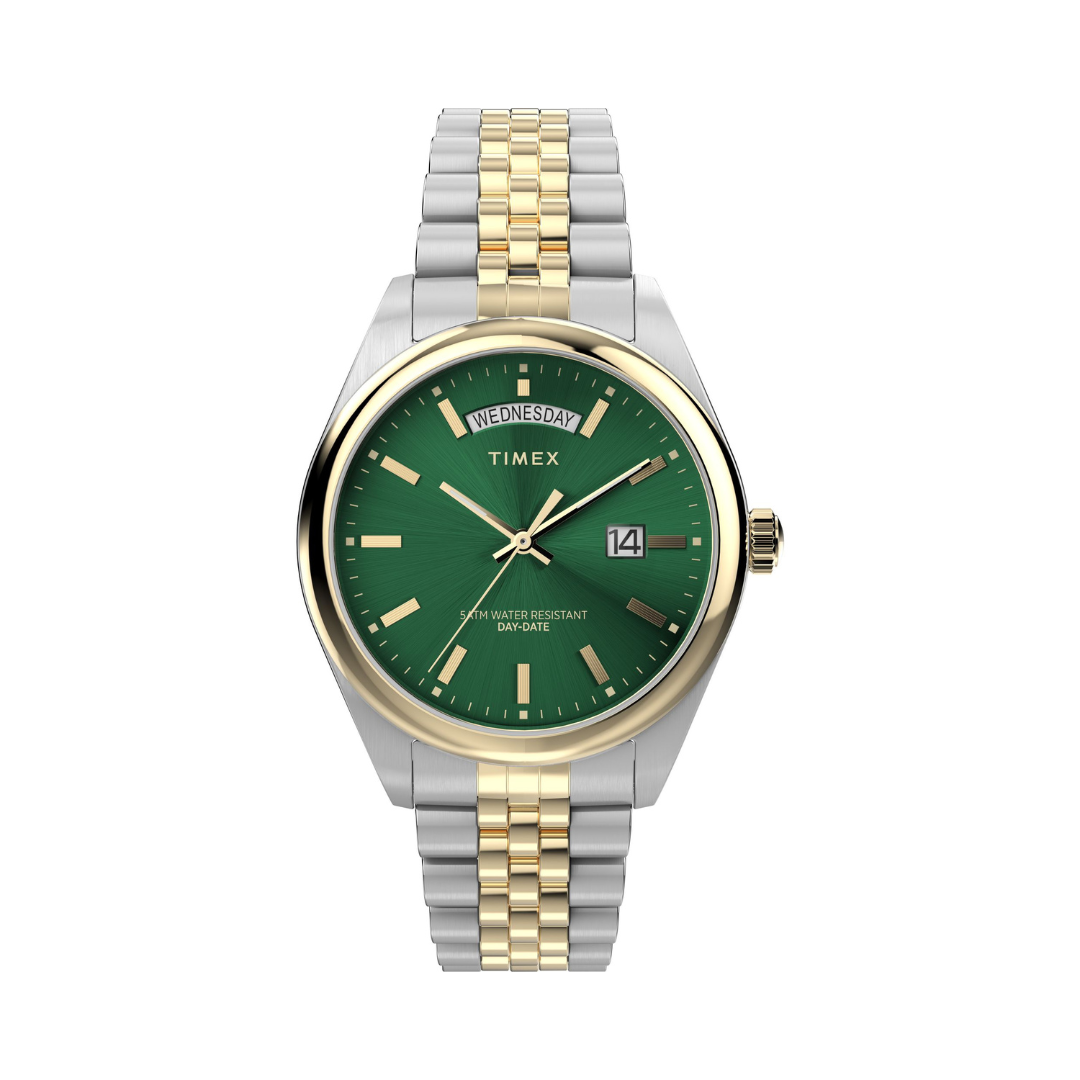 Classic design meets modern detail in the Timex Legacy Watch, featuring a striking green dial paired with a refined two-tone stainless steel bracelet. The rich dial colour brings depth and personality, while the silver and gold-tone finish adds timeless versatility that works effortlessly with both casual and elevated looks.