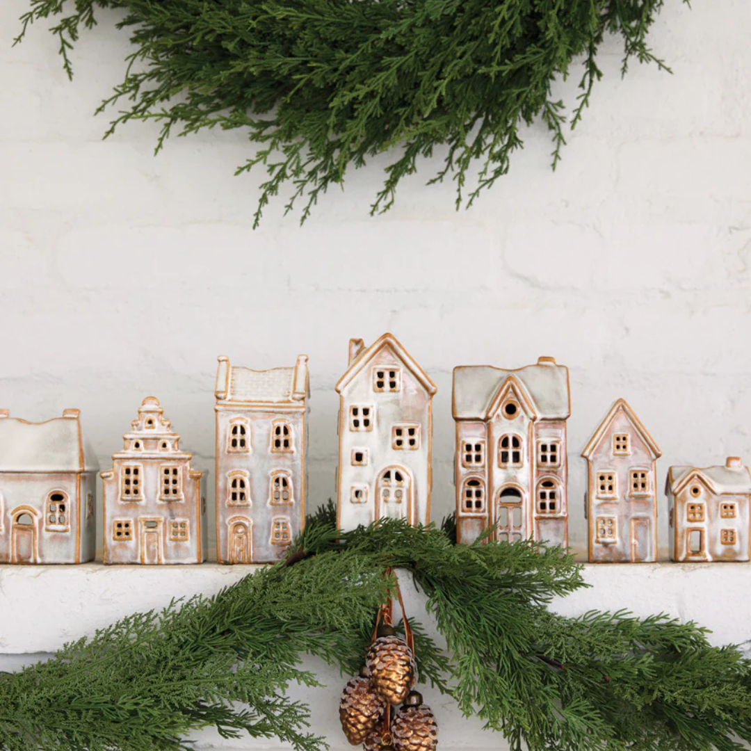 This charming ceramic terrace house brings soft, nostalgic magic to your festive styling. With its misty hand-glazed finish and beautifully detailed windows, it transforms any tealight or LED candle into a gentle, glowing display of holiday cheer.