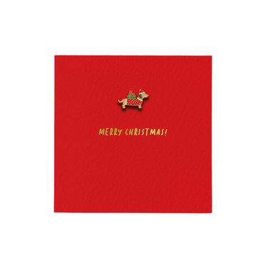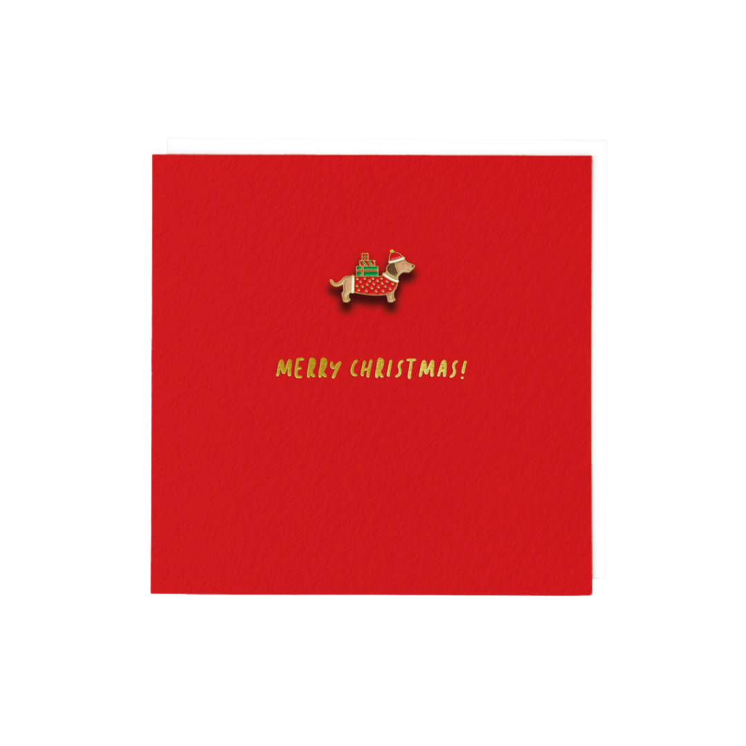 Send festive cheer with a touch of cuteness! This bright and joyful Christmas card features a charming sausage dog design on a bold red background - complete with a matching pin that makes a perfect keepsake.
