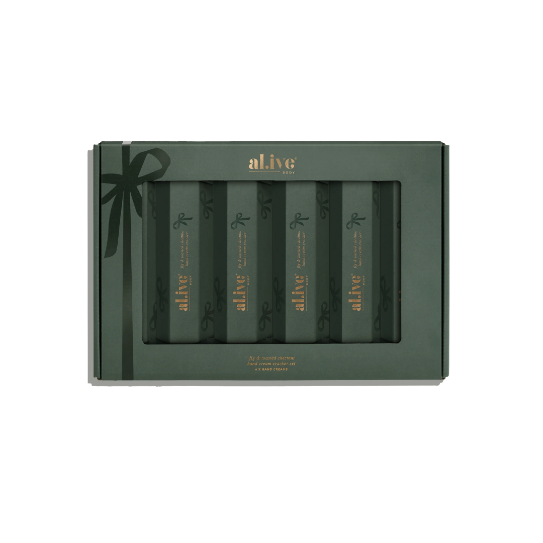 This Limited Edition Hand Cream Cracker Set in Fig & Toasted Chestnut is a generous collection of six luxurious hand creams, each beautifully presented in festive cracker packaging that doubles as table décor.