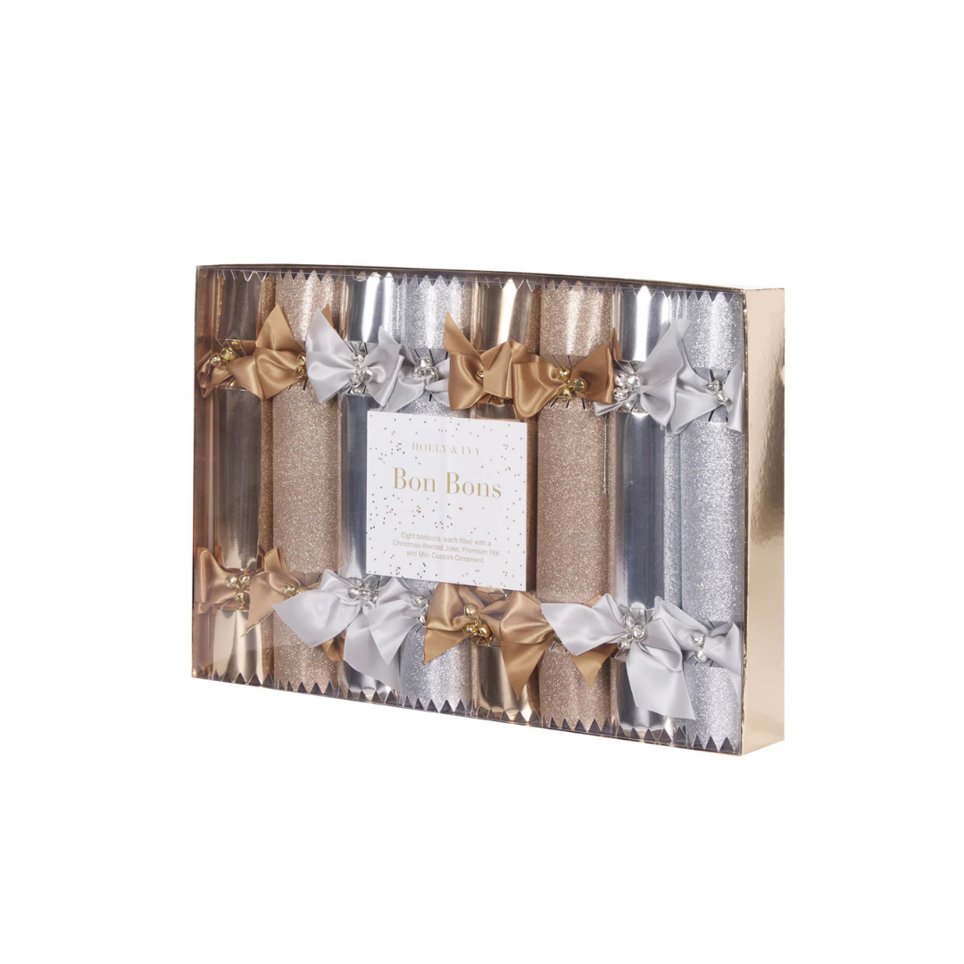 Bring sparkle and sophistication to your festive table with our Stardust Metallic Bon Bons. This elegant set of eight features a mix of champagne gold and silver tones, each finished with a luxe satin bow and metallic detail - because even your Christmas crackers deserve a little glamour.