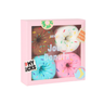 4 pairs of socks shaped as a box of donuts. Multi-coloured.