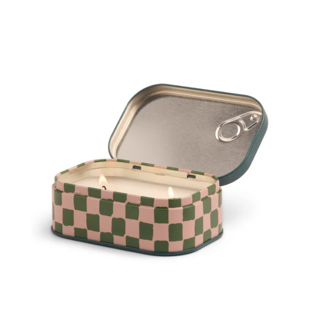 4.5 oz. Two-Wick Tin Candles | With a faux pull-tab for added character inspired by sardine tins, these tin candles with hand illustrated artwork offer a cozy glow with its two wicks, and a comforting scent.