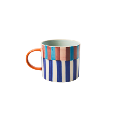 Classic chic stripes meet your morning cuppa. This handpainted blue striped mug features bold vertical lines in playful colour combinations and a soft blue interior and coloured handle. Crafted from earthenware clay, it's the perfect balance of sturdy and stylish. Whether you're pairing it with toast on a Bloomie dish or just your thoughts, this one's a keeper.
