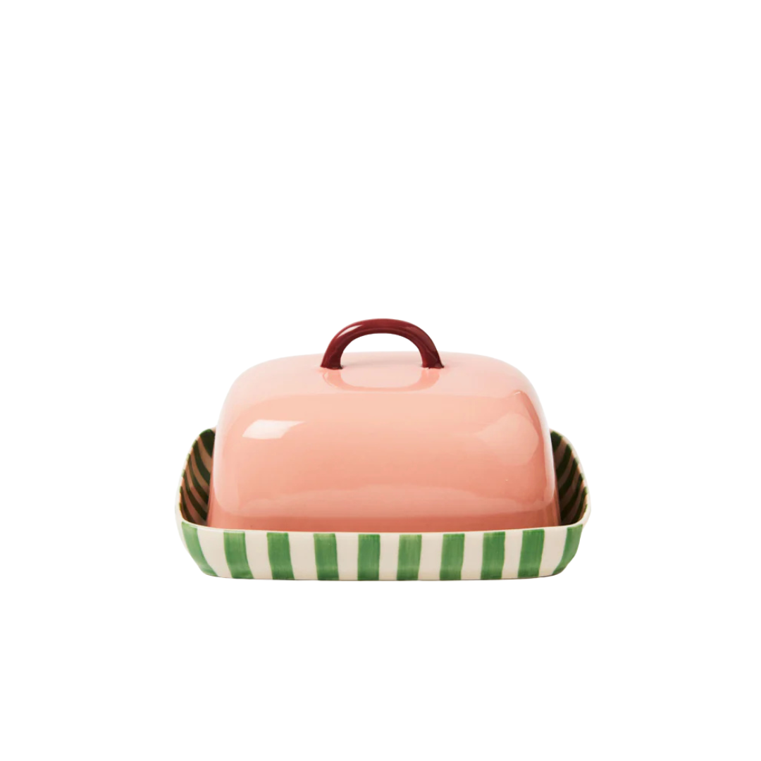 Sweet and satisfying, this pink ceramic butter dish is all about joyful detail, like the soft green striped base, hand-formed handle, and warm blush lid. Made from durable earthenware and painted by hand, it's a pretty way to keep butter out on the counter (and get compliments while you do it).