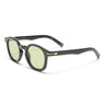 Finished in shiny black with bright gold hardware and green lenses for a sleek look.