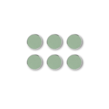 The Buttons have a lovely smooth flat surface bordered by a shiny silver edge. Their magnetic backs are made from neodymium, making them super strong! Packs of six are available in each of our 12 signature colours, so you can have fun mixing and matching.