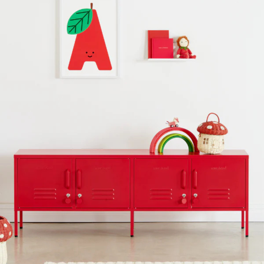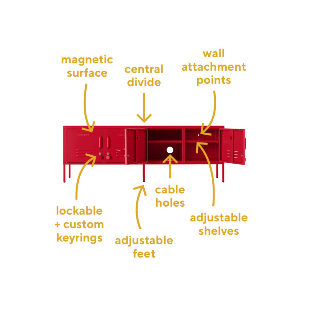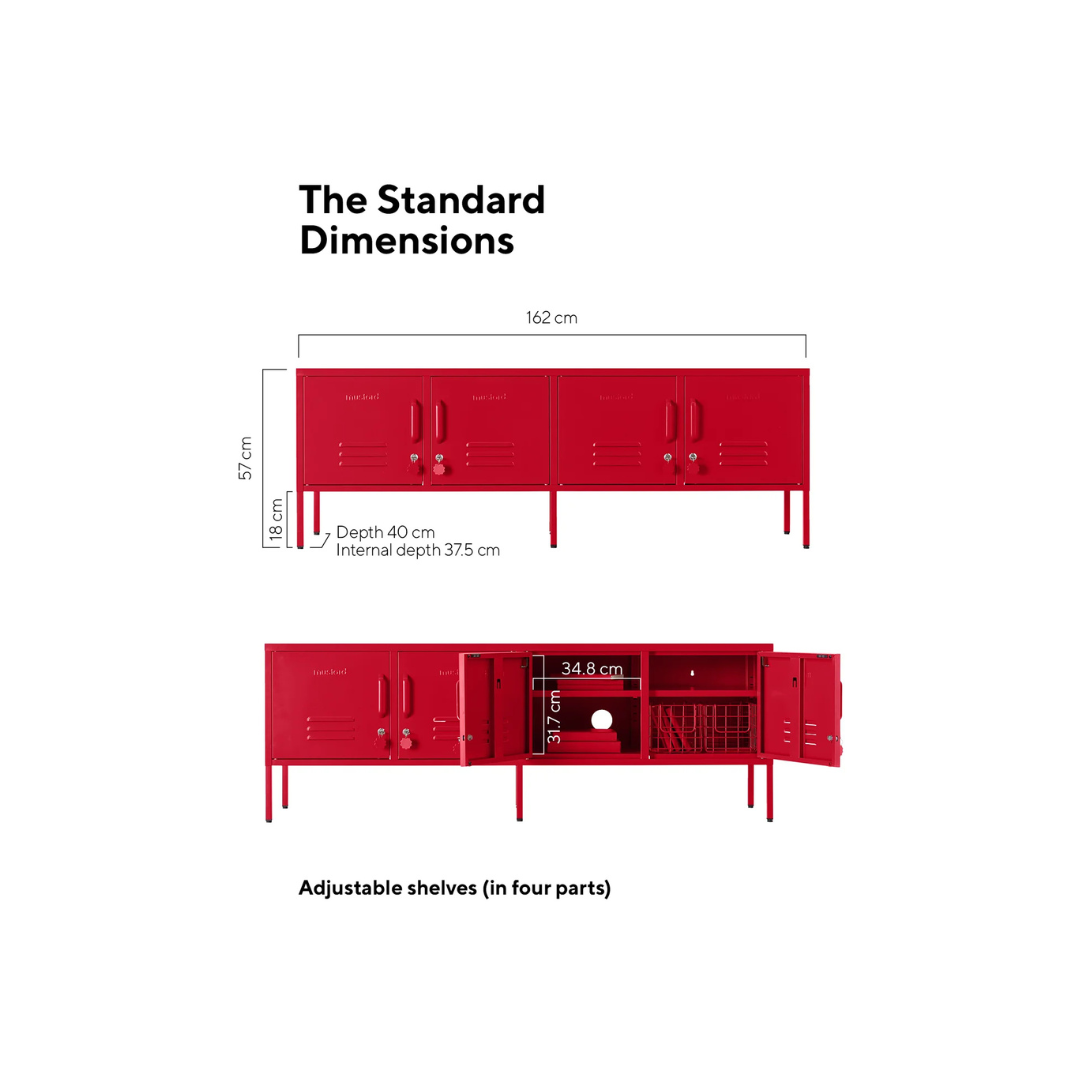 Meet our long + lean four door locker. She’s the ultimate multitasker and your one-stop for storage, whether you use her as a TV unit, entertainment hub, shoe organiser or at the foot of your bed. With two cable holes to keep things tidy and a lock on every door, she’s a console with confidence. It’s time to set the Standard!