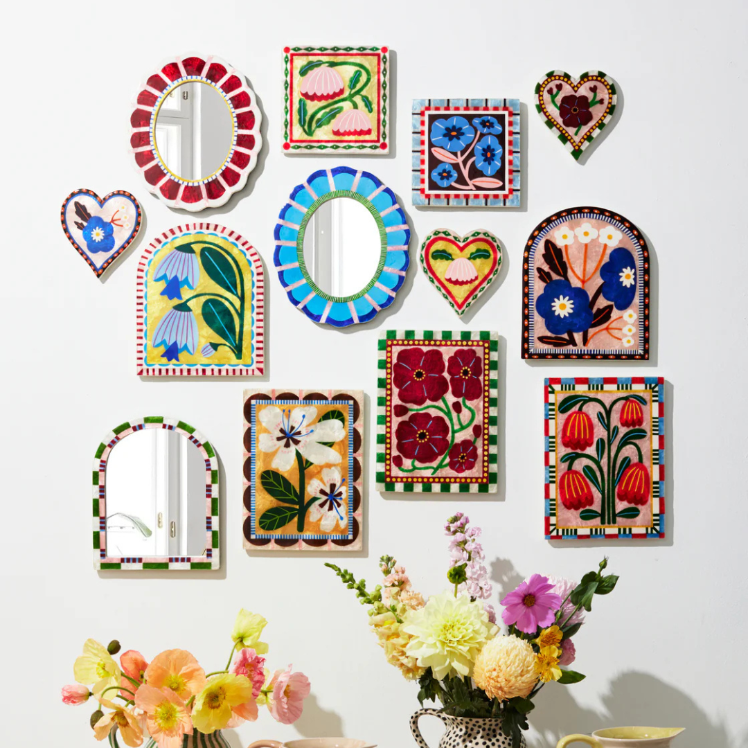 Discover Bloom Nouveau: a premium wall art collection blending Art Nouveau inspiration for a joyful contemporary home aesthetic. Featuring Capiz shell tiles and mirrors, each piece showcases vibrant hand-painted florals alongside bold graphic patterns. These versatile artworks combine nature-inspired motifs with contemporary designs, creating stunning displays that elevate any space. Mix and match Bloom Nouveau's tiles and mirrors to transform your walls into a gallery of light-catching, floral elegance.