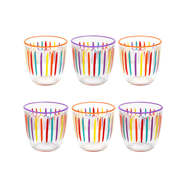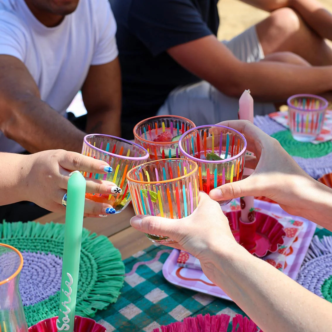Our Bright Striped Multi-Coloured Tumblers are joy in a glass. Bursting with colour and covered in beautiful, rainbow stripes with contrasting rims, we wouldn’t be surprised if your guests tried to sneak off with them after dinner.
