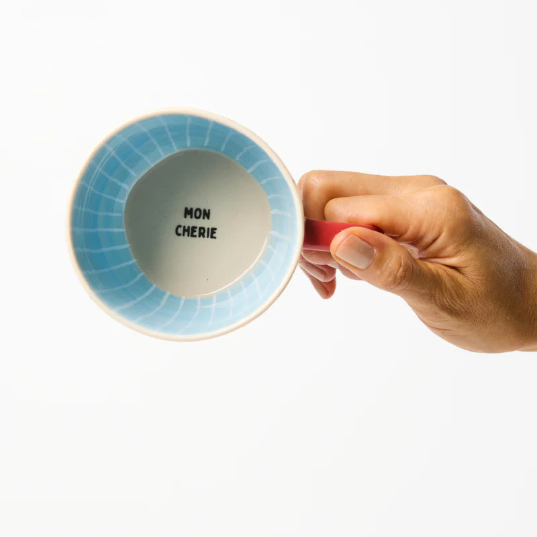 Light blue stripes hug the interior of this hand-cast mug, while the phrase "Mon Cherie" waits at the bottom a small endearment between you and your morning brew. The vibrant red handle and hand-painted cherries on the exterior creates a playful contrast that speaks to our Sydney design teams love of thoughtful colour combinations and the skill of our Vietnamese artisans.