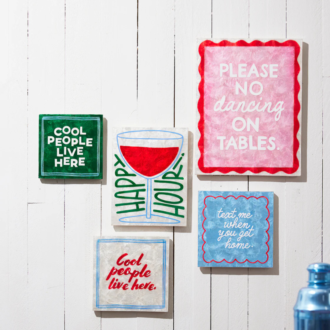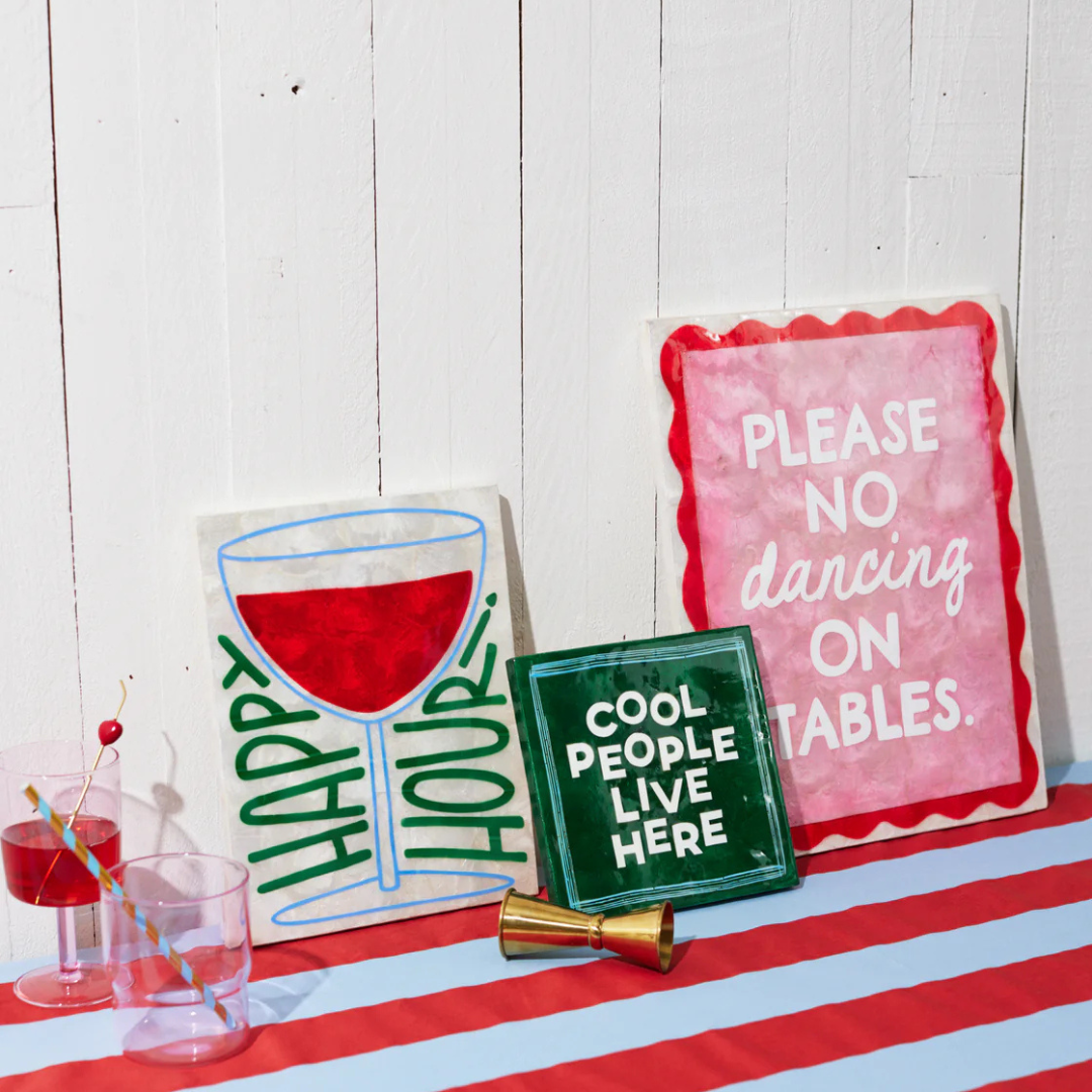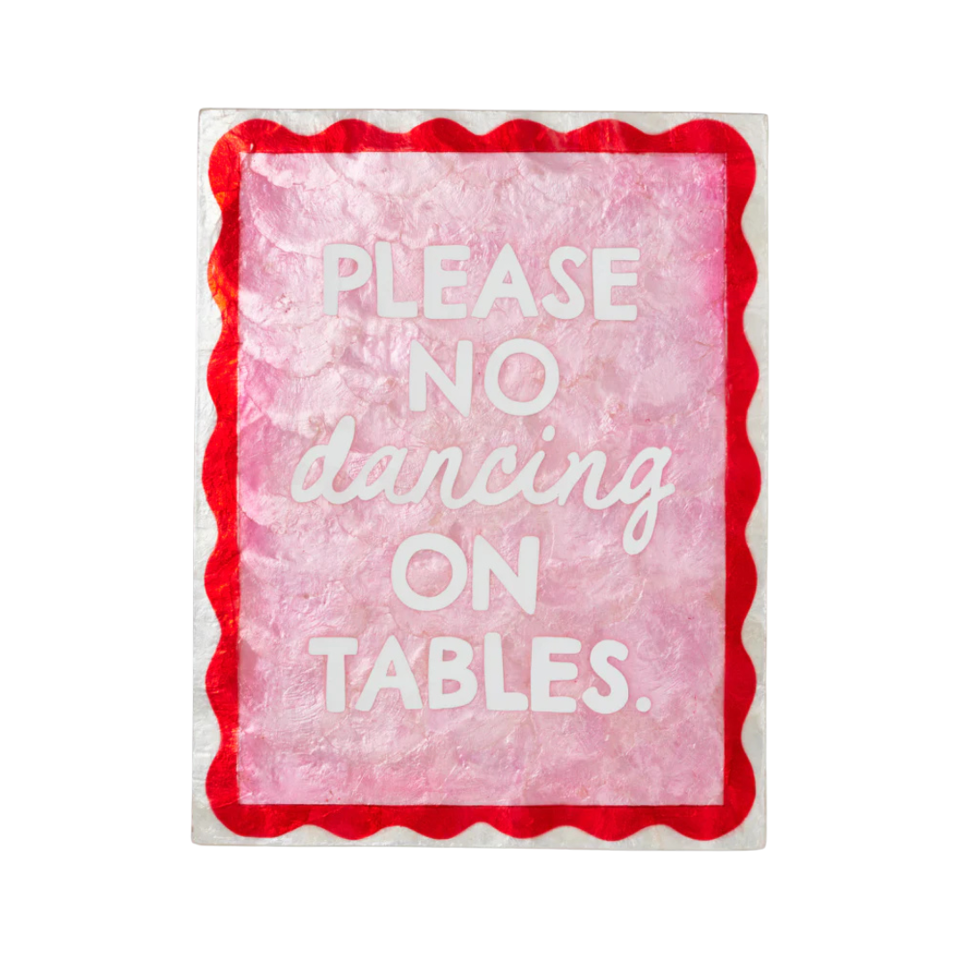 Bring playful fun energy to your space with the Fun House Dancing Tile. This oversized, handcrafted capiz shell tile boasts a vibrant pink hue and cheeky red squiggle border framing the playful phrase "Please No Dancing On Tables". Perfect for entertaining areas, this one-of-a-kind artisan piece injects personality with its light-hearted reminder to embrace fun (responsibly ha ha). Crafted with artistry, it blends capiz shell allure with hand-painted charm. Ready to hang with a hook on the back.
