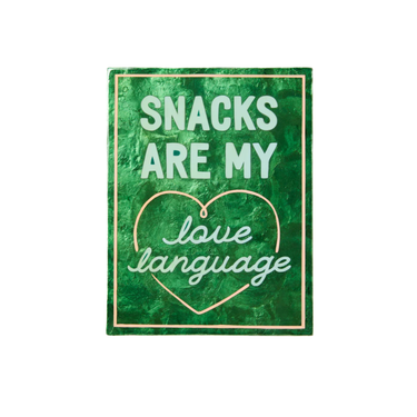 Snacks are a love language, and this snack quote tile makes it official. Crafted from glossy capiz shell and painted in rich green with a pretty pink heart, it's a cheeky addition to your kitchen, pantry or snack zone Makes a super fun gift.
