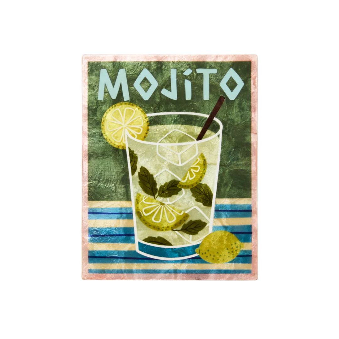 Fresh, fizzy and full of minty goodness. Our Mojito cocktail tile is a nod to your favourite summer sip, complete with lime wheels, mint sprigs and striped retro vibes. Handpainted on capiz shell with that signature mother of pearl shimmer of ours.