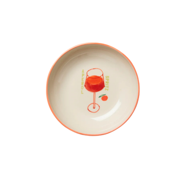 Zesty and fresh with a twist of orange. This Aperol spritz cocktail bowl is hand-painted with a bright citrus rim and a stylised spritz illustration in the centre. Stack them high and serve with joy.
