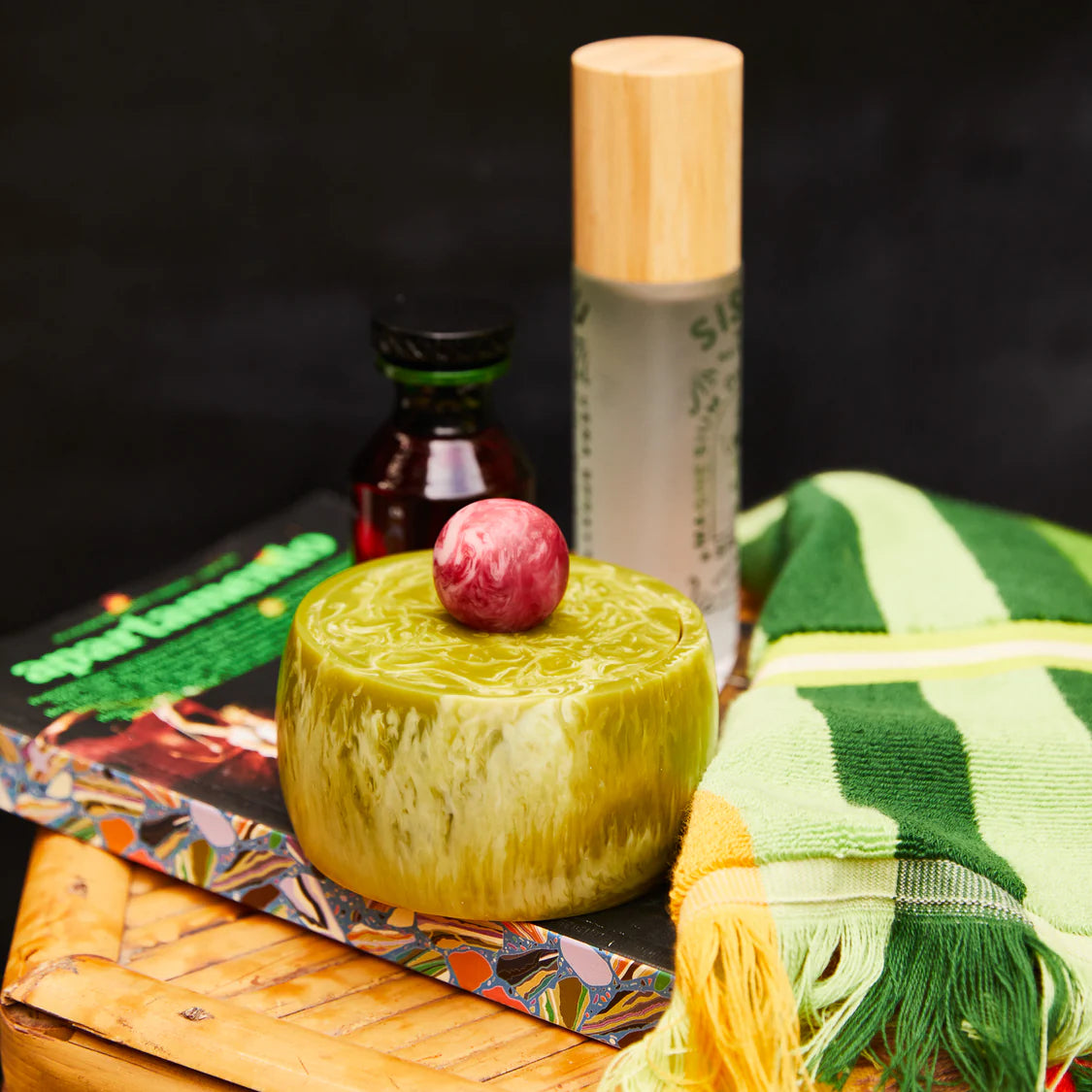 Defined by its smooth curves and sculptural form, this resin canister channels mod vibes with a bold yet refined silhouette. Crafted to hold what you love — jewellery, beauty essentials or tiny keepsakes. Poured and swirled by hand, every piece is entirely unique Designed to delight and crafted to last, the perfect gift for the ones you love Handwash with mild soap and warm water. Dry Immediately after use. Avoid prolonged soaking. Do not allow direct contact with hot foods. Not dishwasher or microwave safe. Food safe.