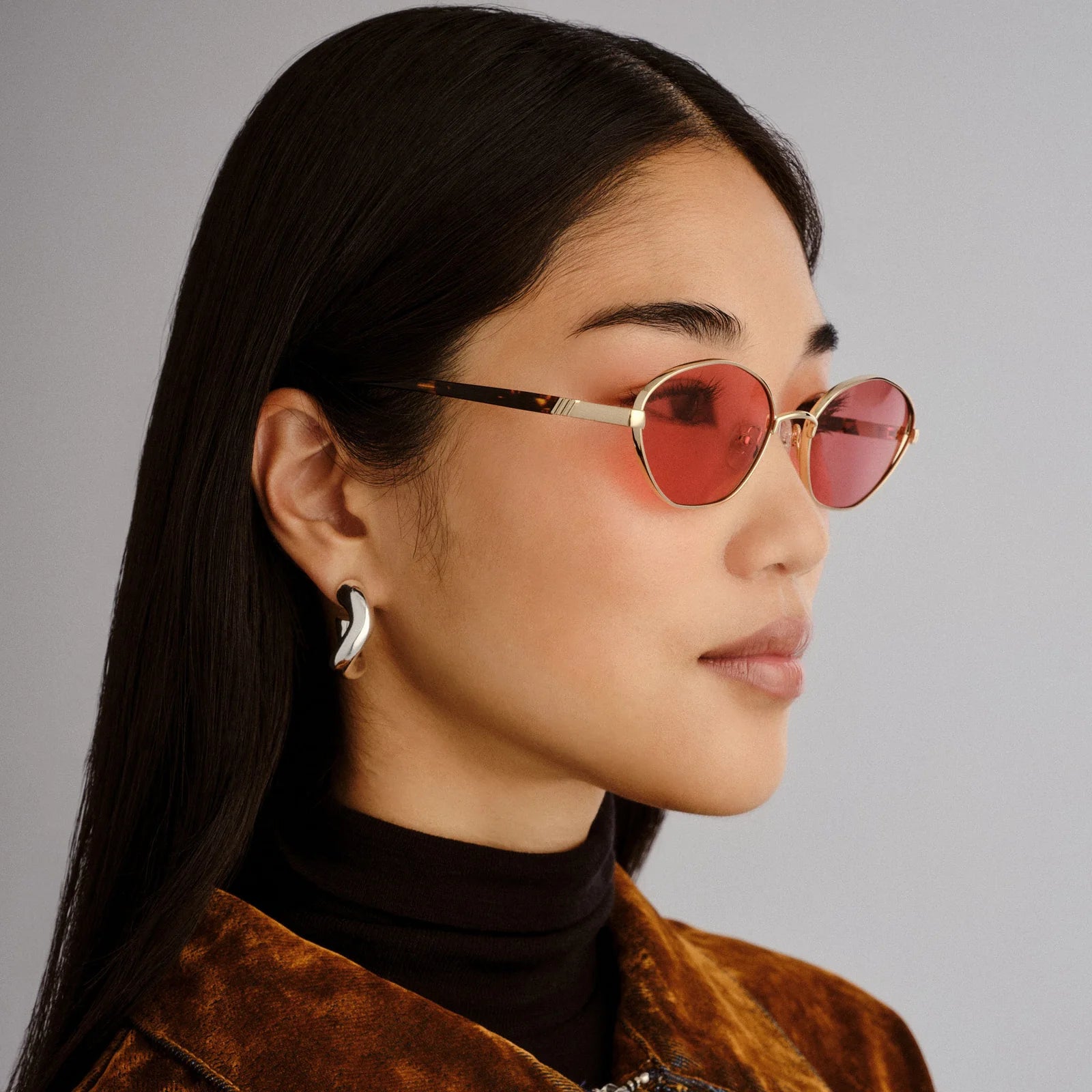 • Finished in a gold frame with crimson tint lenses.