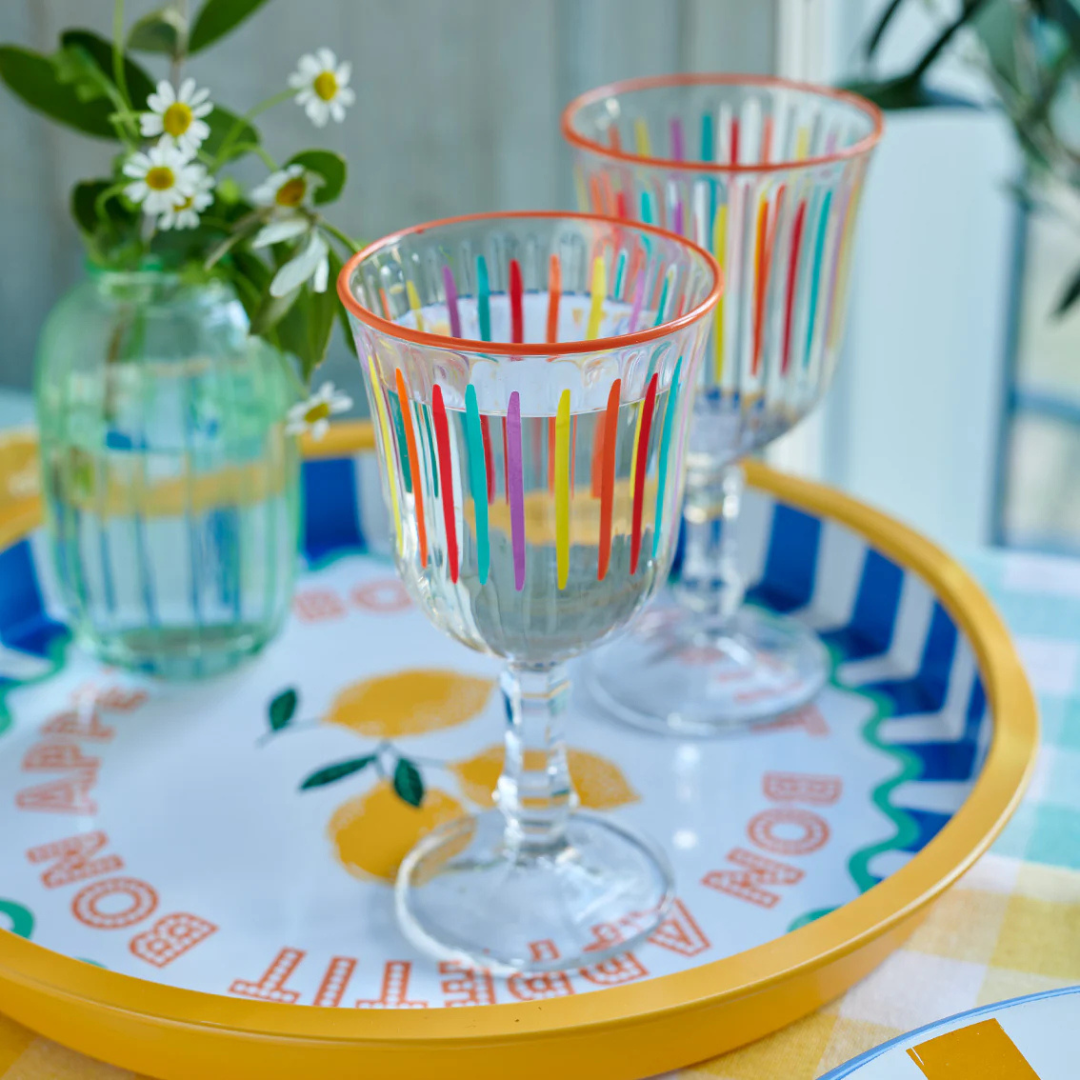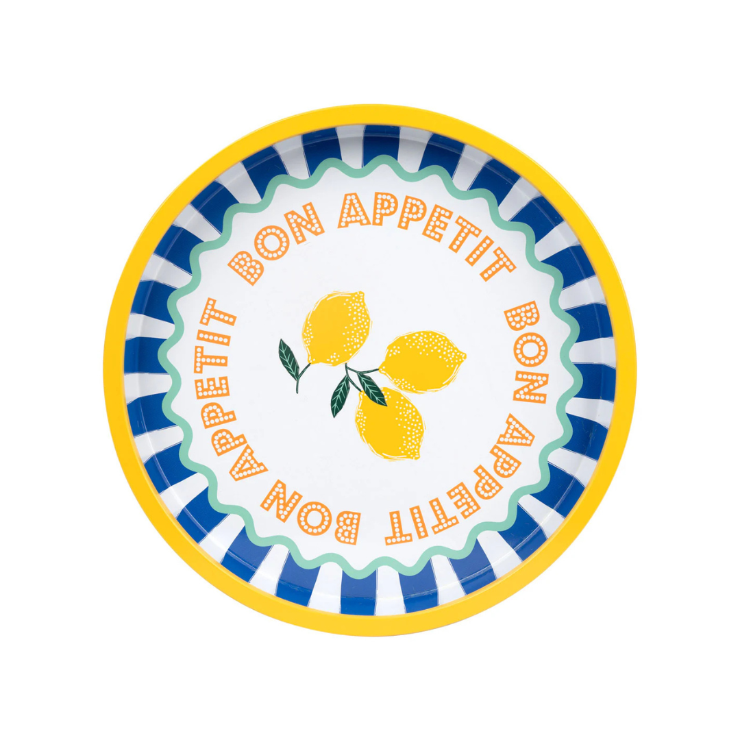 You can holiday on the Mediterranean without leaving home, with our Bon Appetit Tin Tray. Featuring a coastal inspired blue striped border and zesty lemon motif with circular text, it evokes the feeling of a hot summer holiday. It pairs beautifully with our blue stripped glassware for serving up cool drinks.