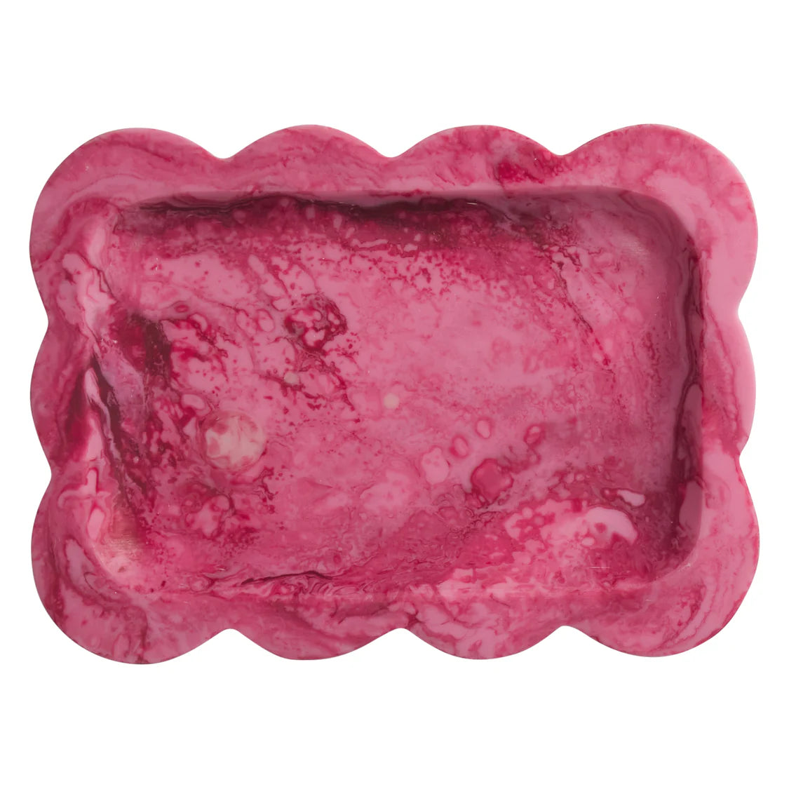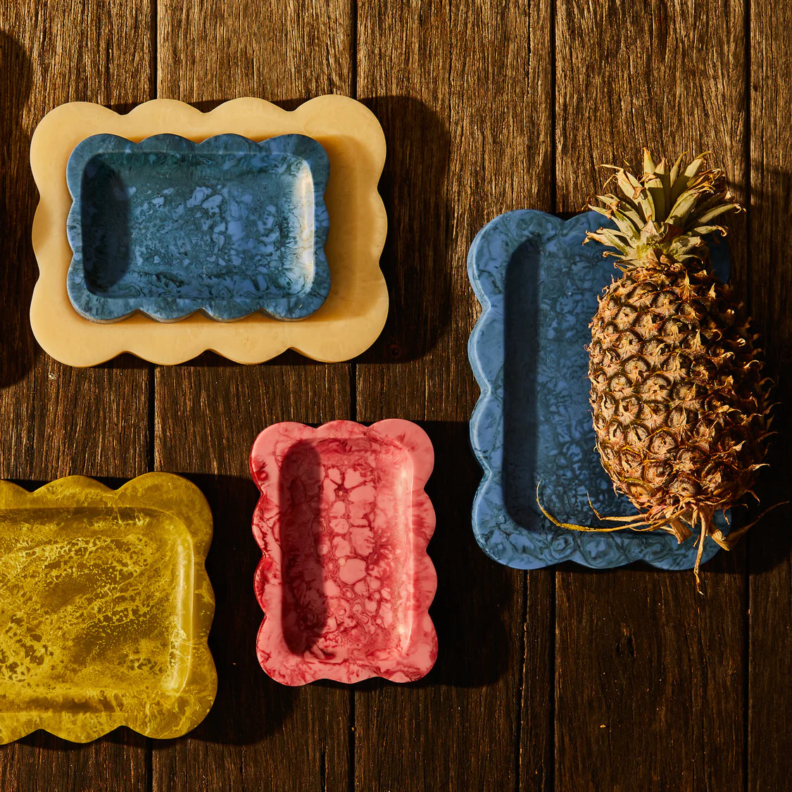 Curved edges and mid-century soul meet everyday living in this elevated resin tray. From bathroom vanity to coffee table, it's crafted to hold everything from fragrances to artful collections. Poured and swirled by hand, every piece is entirely unique Made from food-grade materials for enduring quality and everyday practicality Designed to delight and crafted to last, the perfect gift for the ones you love Handwash with mild soap and warm water. Dry Immediately after use. Avoid prolonged soaking. Do not allow direct contact with hot foods. Not dishwasher or microwave safe. Food safe.