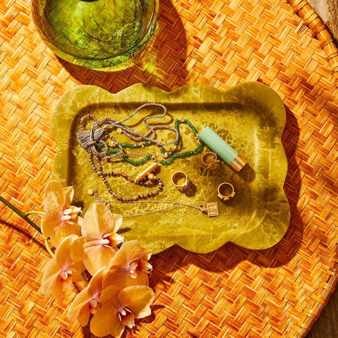 Curved edges and mid-century soul meet everyday living in this elevated resin tray. From bathroom vanity to coffee table, it's crafted to hold everything from fragrances to artful collections. Poured and swirled by hand, every piece is entirely unique Made from food-grade materials for enduring quality and everyday practicality Designed to delight and crafted to last, the perfect gift for the ones you love Handwash with mild soap and warm water. Dry Immediately after use. Avoid prolonged soaking. Do not allow direct contact with hot foods. Not dishwasher or microwave safe. Food safe.