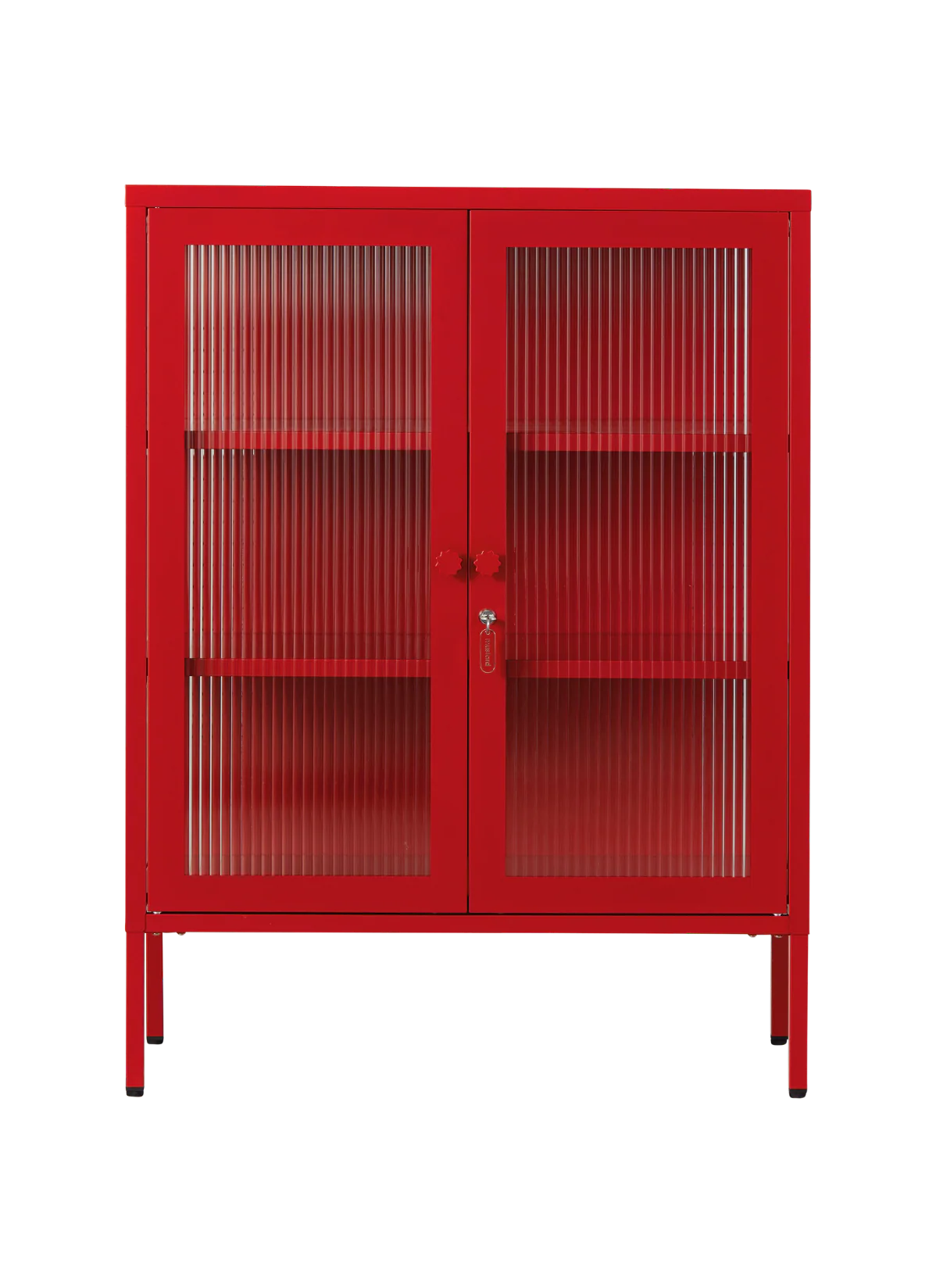 Two adjustable shelves, lockable doors and fluted glass panels set in a metal frame.