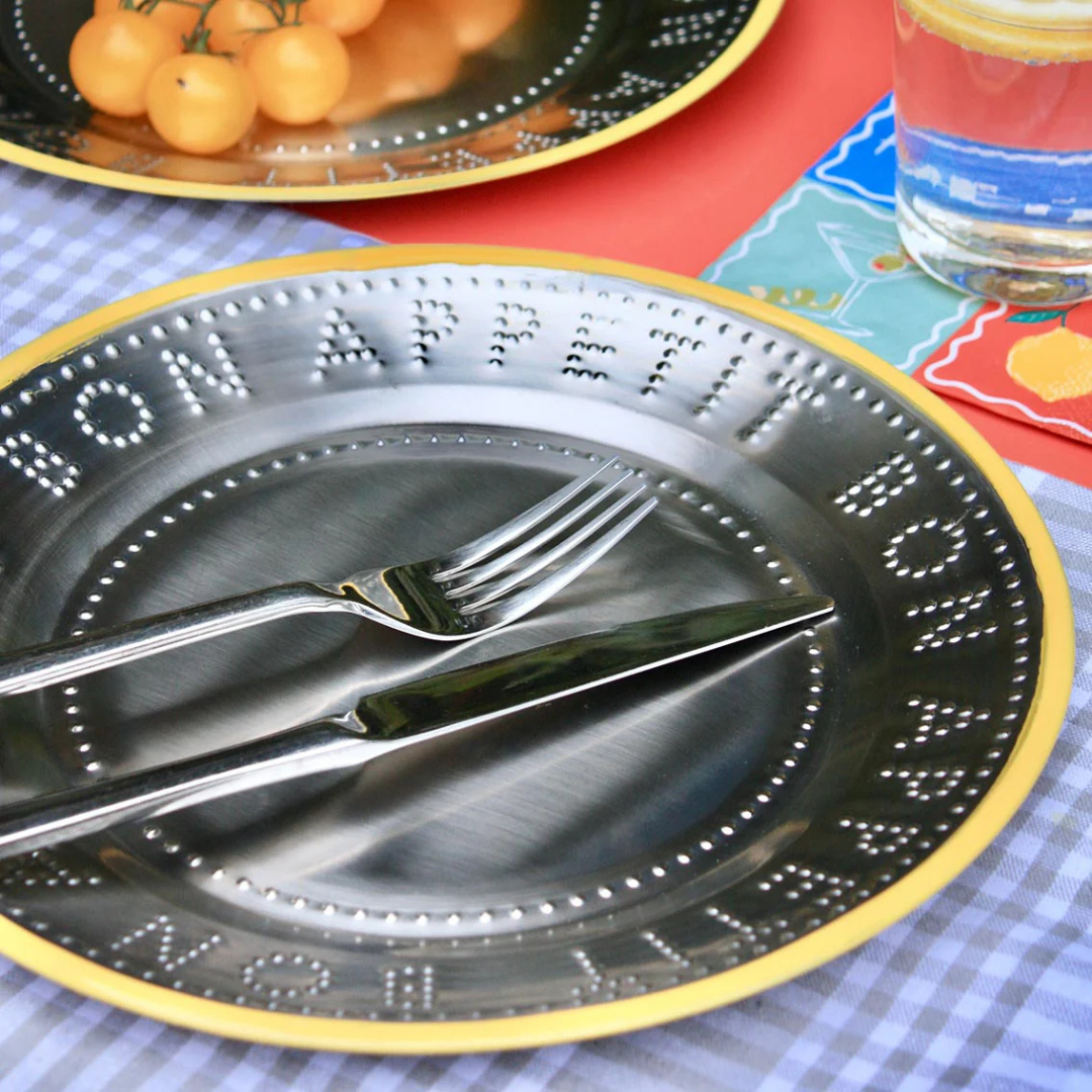 Our shimmery Bon Appetit stainless steel embossed plates are sure to make an impression. Handmade in India, they’re lightweight, shatterproof and dishwasher safe, making them a perfect picnic and relaxed dining choice. Also available with an orange, blue and green enamel trim.